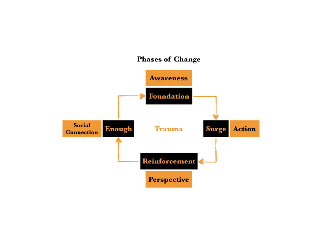 For my introspective analysis, I adapted a four-phase process of change from the trauma research of Dr. Peter Levine in his book Waking the Tiger: Healing Trauma to explore and explain how I journeyed to self-acceptance and change. The four phases were foundation, surge, reinforcement, and enough, which translate to Dr. Levine’s intended outcomes of awareness, action, perspective, and social connection. Here is my interpretation of Dr. Levine’s process for healing trauma shown with my adapted process for stuttering: