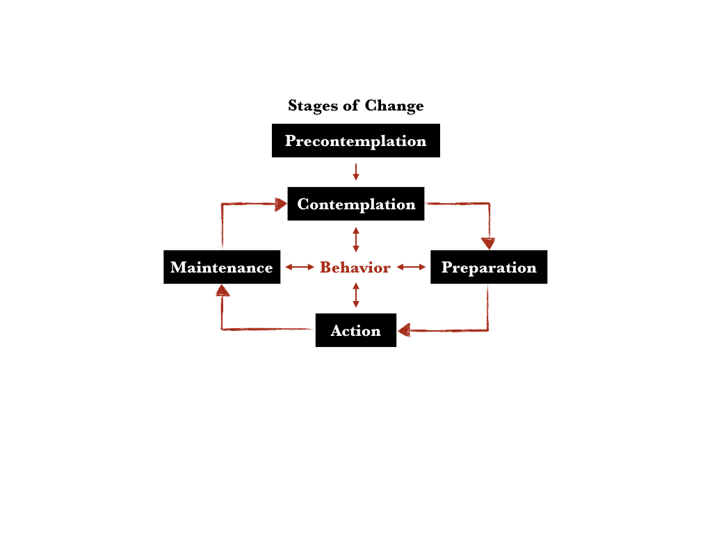 Dr. Rodgers and Dr. Gerlach-Houck relied upon the five-stage continuum of behavior change developed by Dr. James Prochaska called the transtheoretical model. The trans- what? I tripped up on it too and had to do some Googling. Readiness for change is the key and the stages exist on a continuum as a “dynamic cognitive progression.” Here are the five stages of change: